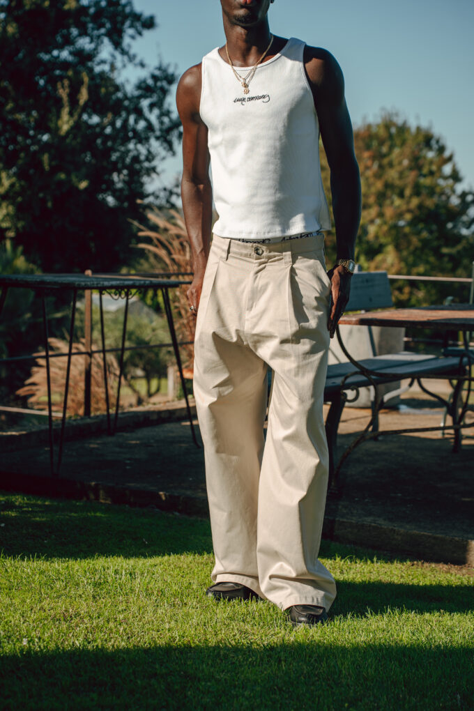 Beige suit trousers with two subtle pleats, wide cut, 100% organic cotton, inner waistband covered with a custom elastic for greater comfort, back leather patch with orange uap’s brand logos.